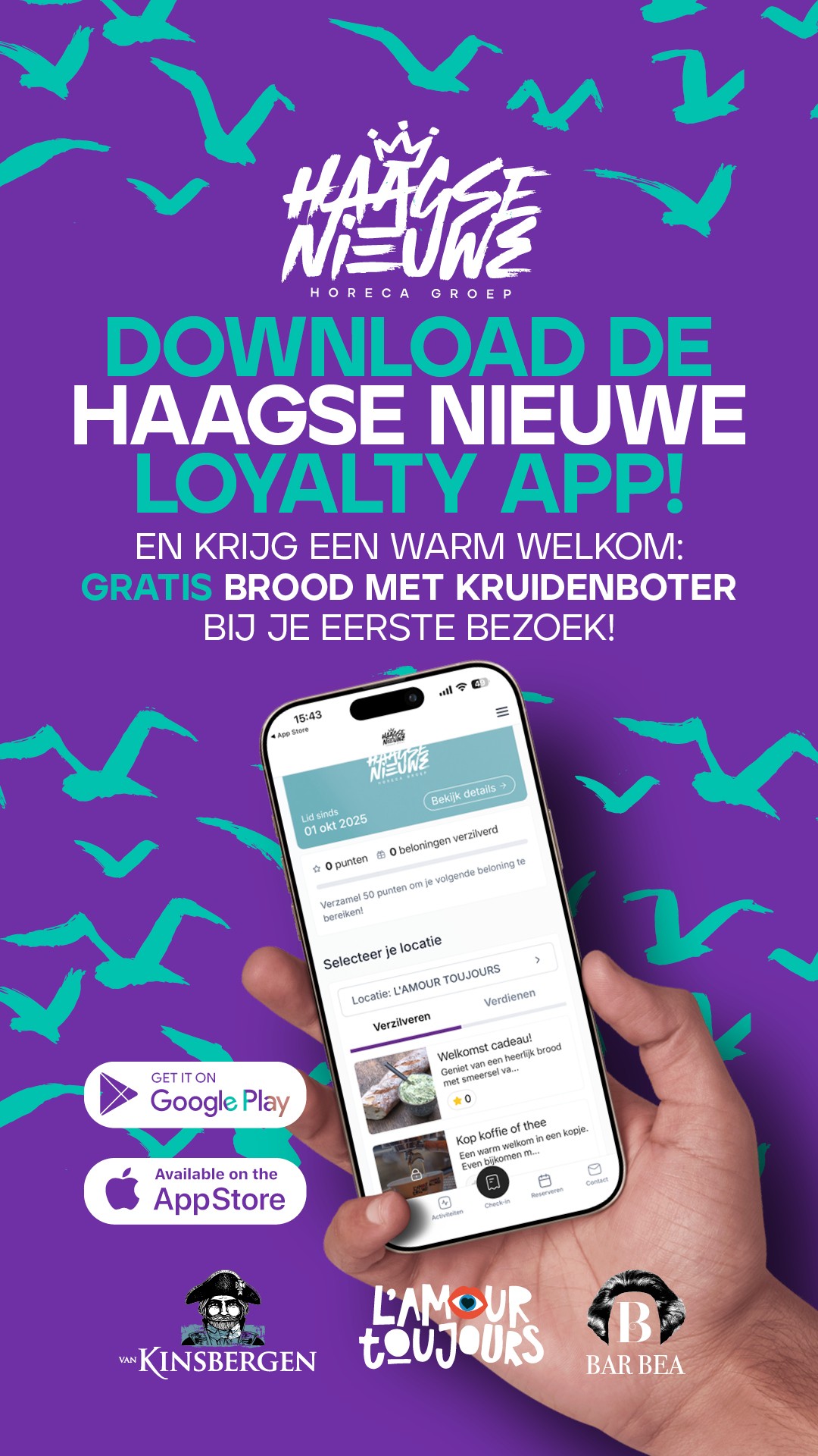 Craving free bitterballen, a beer on the house, or even a dinner for two? With the Haagse Nieuwe app, you easily collect points every time you visit Van Kinsbergen, Bar Bea, or L’Amour Toujours. 👉 No hassle: your points are added automatically — or simply snap a photo of your receipt in the app. Super easy! 📸 🔑 How does it work?